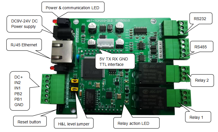 WST-TCP2IO-212 is a high performance and good price IOT network controller. It has 2 channels of input and output interfaces with a 10M/100M Ethernet RJ45 port can be compatible for correspondence of TCP/IP communication. User can easily and quickly integrate WST-TCP2IO-212 into own system to realize remote, LAN and local control which based on Ethernet, RS485 and RS232. It was developed to interface industry control area such as automatic light system, motor control, door access control, etc. The device is easy to be connected and can be remotely control by computer (include laptop, Raspberry Pi, Jetson nano, etc.) based on our free SDK. The controller working on DC9V to DC24V wide power supply, and the relay output can be controlled of AC105V to AC250V (10A) equipment.