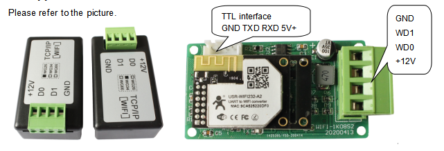 This is an embedded 802.11 b/g/n Wi-Fi IOT module which can connect Wiegand device with Wi-Fi network to realize control and management for access control system. It can realize bidirectional transparent data transmission between Wiegand and Wi-Fi network with simple setup