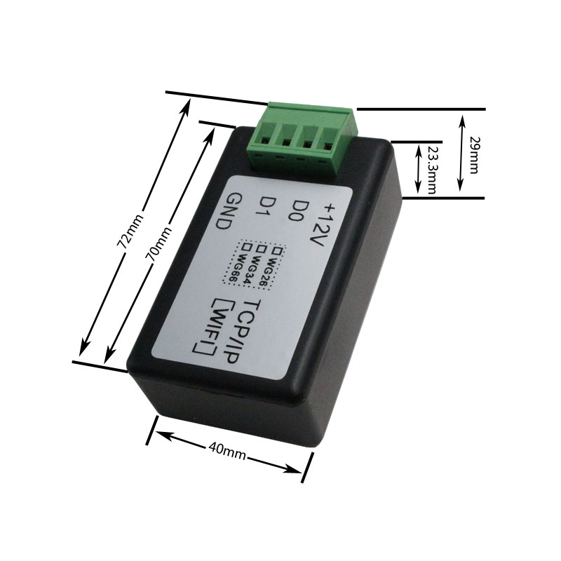 This is an embedded 802.11 b/g/n Wi-Fi IOT module which can connect Wiegand device with Wi-Fi network to realize control and management for access control system. It can realize bidirectional transparent data transmission between Wiegand and Wi-Fi network with simple setup. The device can transfer standard Wiegand 26bit, 34bit to computer software as default via Wi-Fi, and also support TTL communication for testing and upgrade the firmware to suit for special project which need customize Wiegand bit such as Wiegand 37bit,48bit etc. It is really a good wireless IOT Wiegand transfer device for access control.